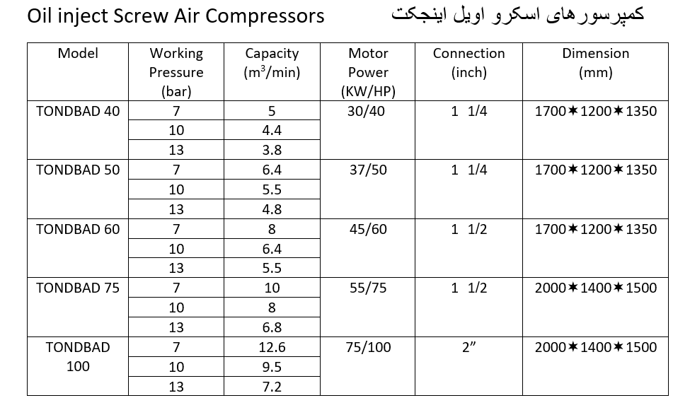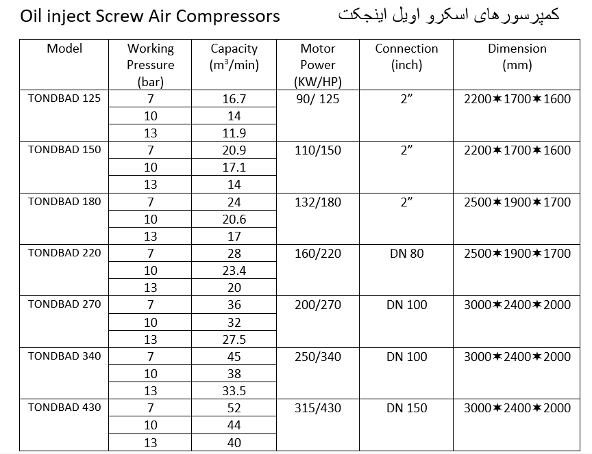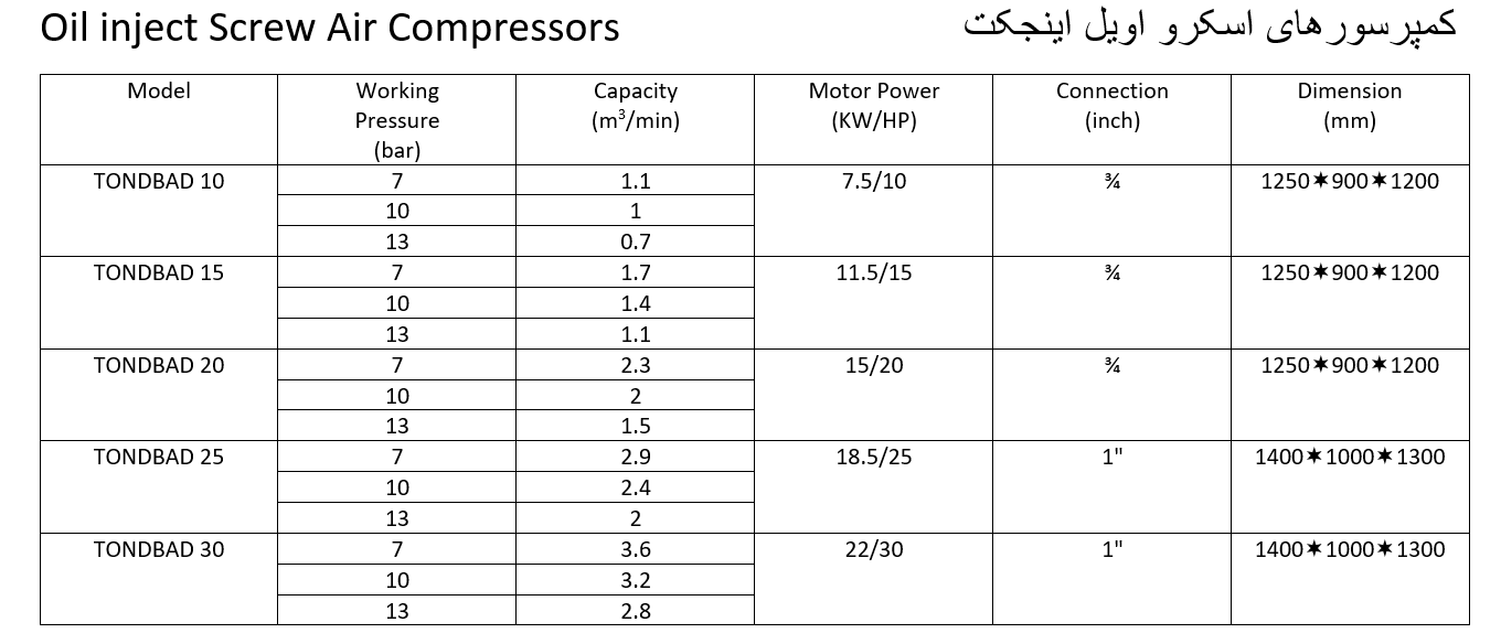 مشخصات فنی کمپرسورهای اسکرو اویل اینجکت هواسازان آیدین